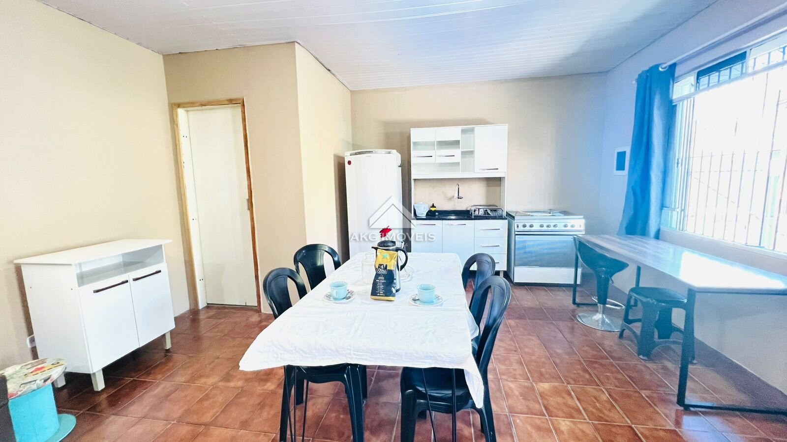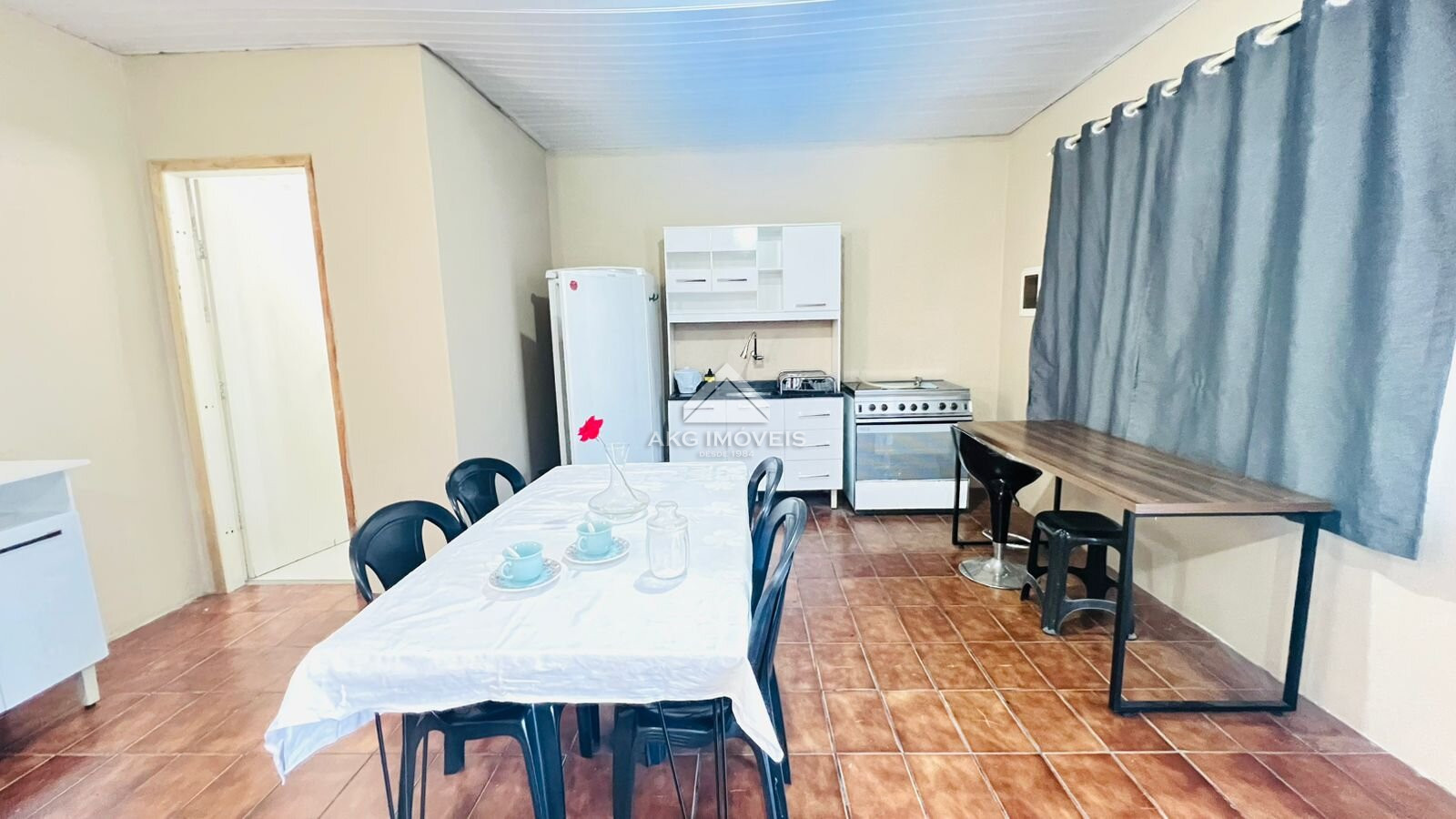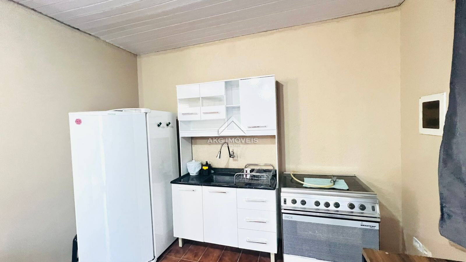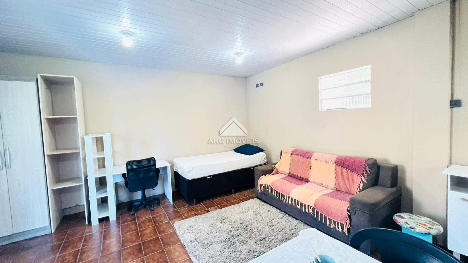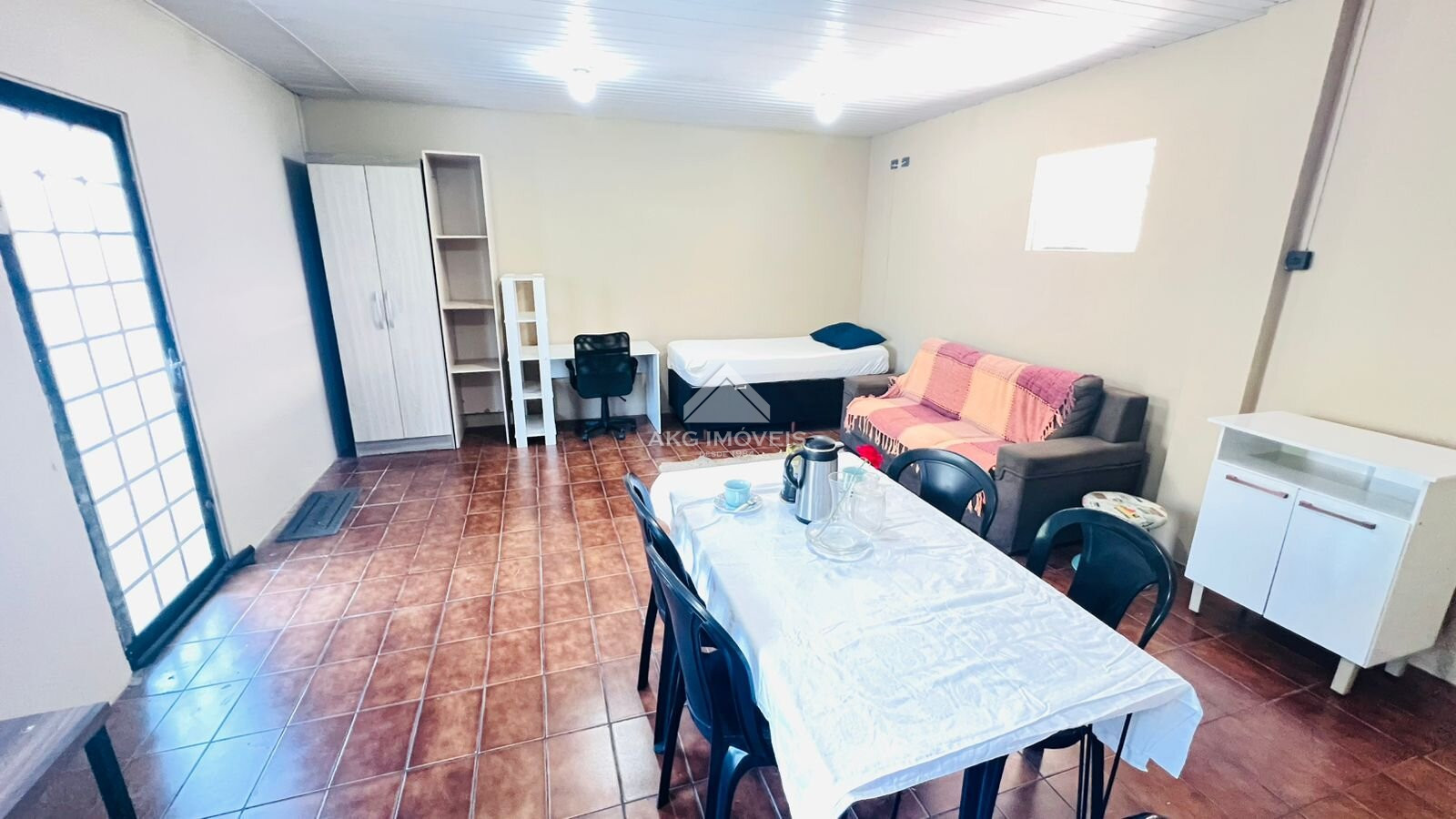 - Semimobiliado: Cozinha com armários, fogão e geladeira. Sala/quarto com mesa, cadeiras, estofado e cama.