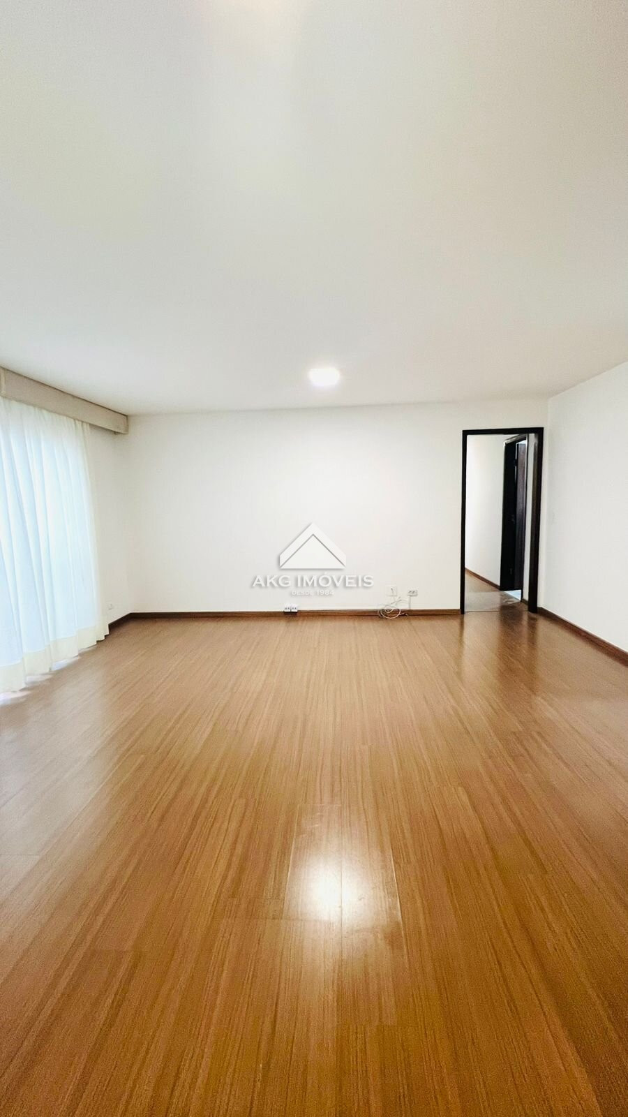 . Piso laminado, luminárias, janelas com venezianas de PVC e arcos externos no contorno superior das janelas