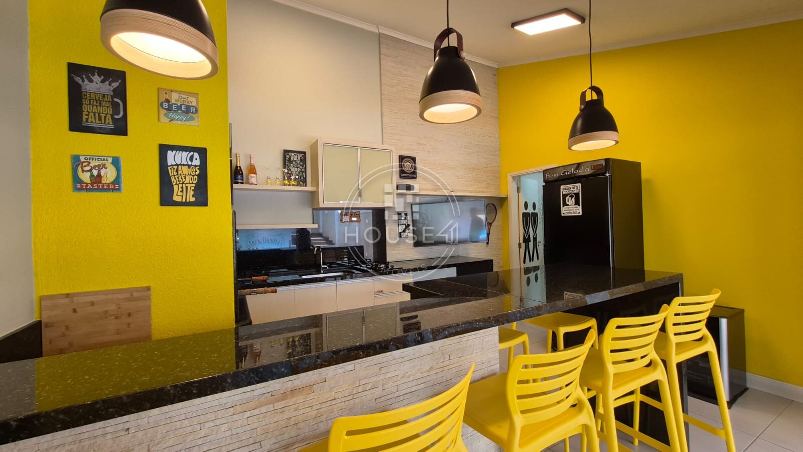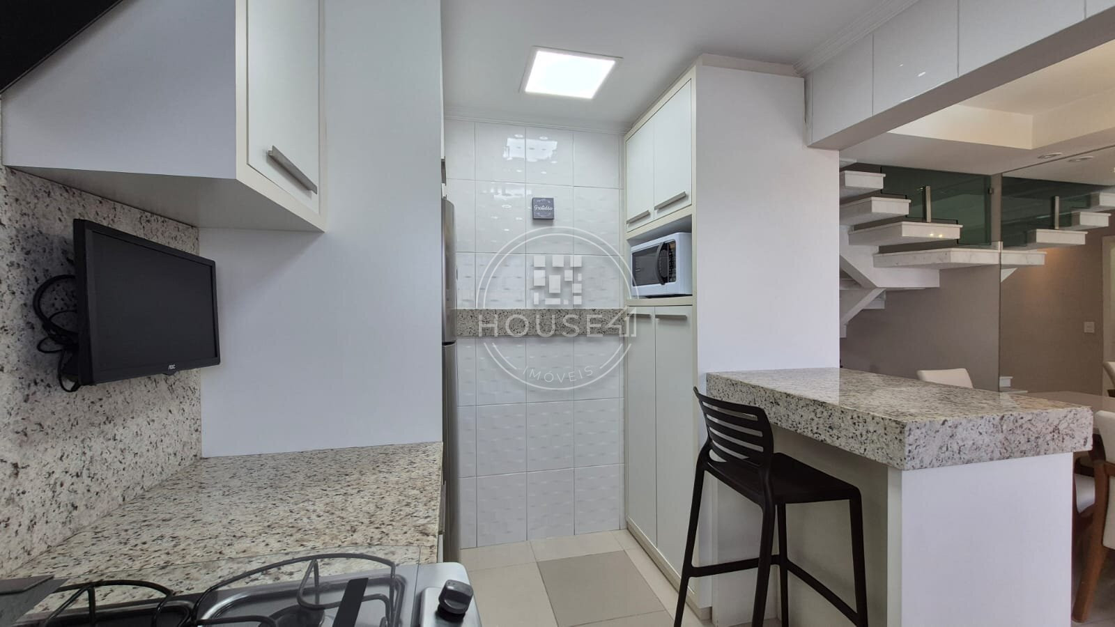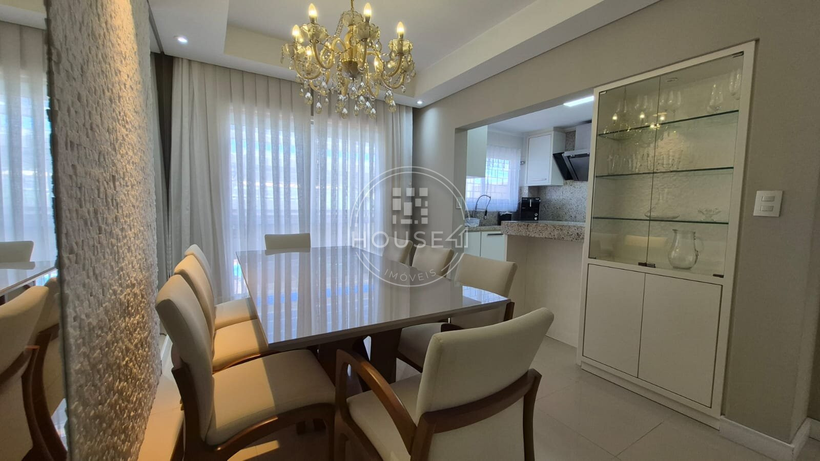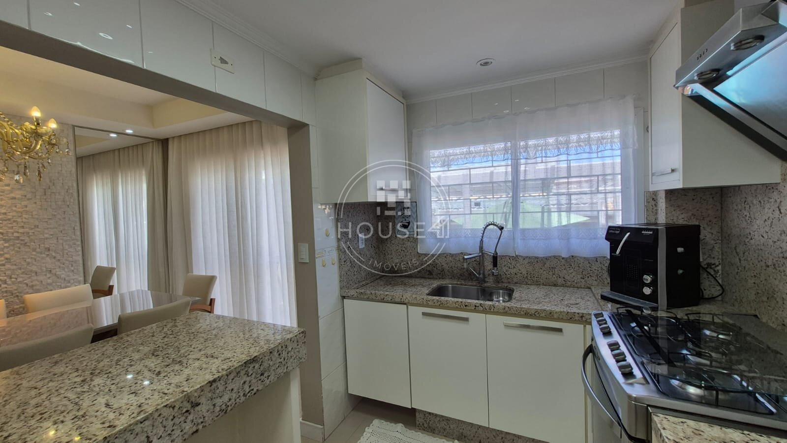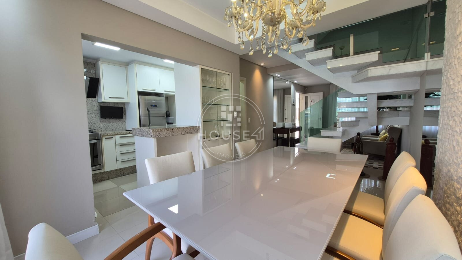 Cozinha e salas integradas, criando um ambiente acolhedor e funcional