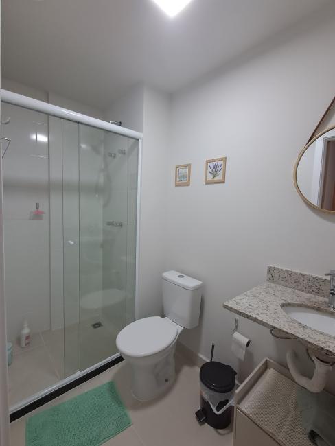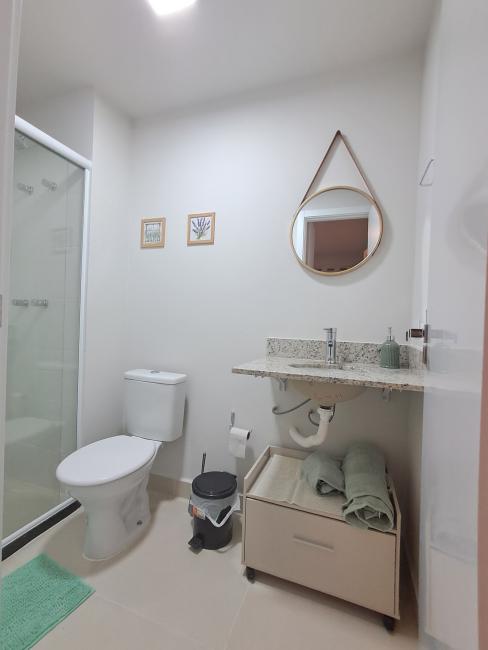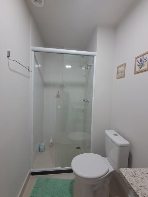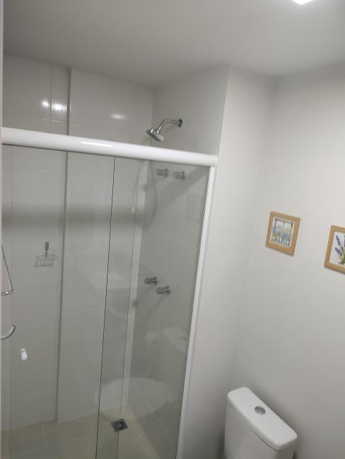 O quarto tem banheiro com box de vidro, armário, torneira com aquecimento a gás e chuveiro com aquecimento a gás.