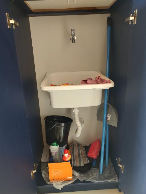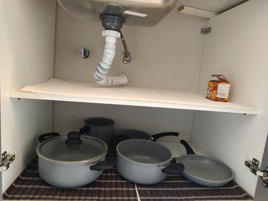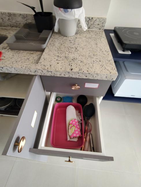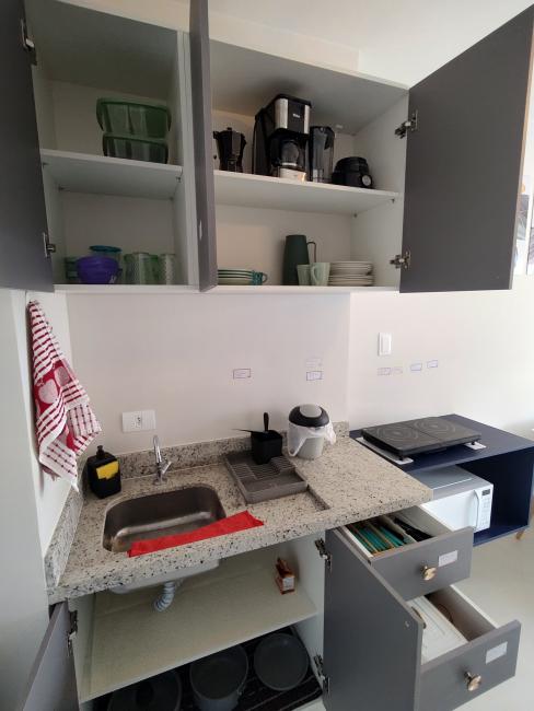 A cozinha conta com pia e armário embaixo da pia e armário aéreo, bancada de granito.