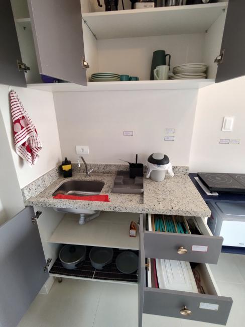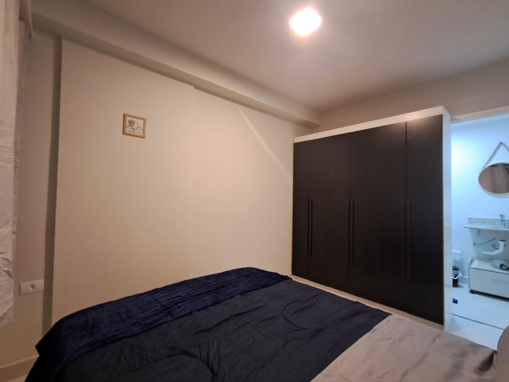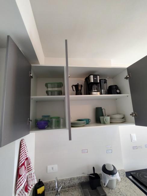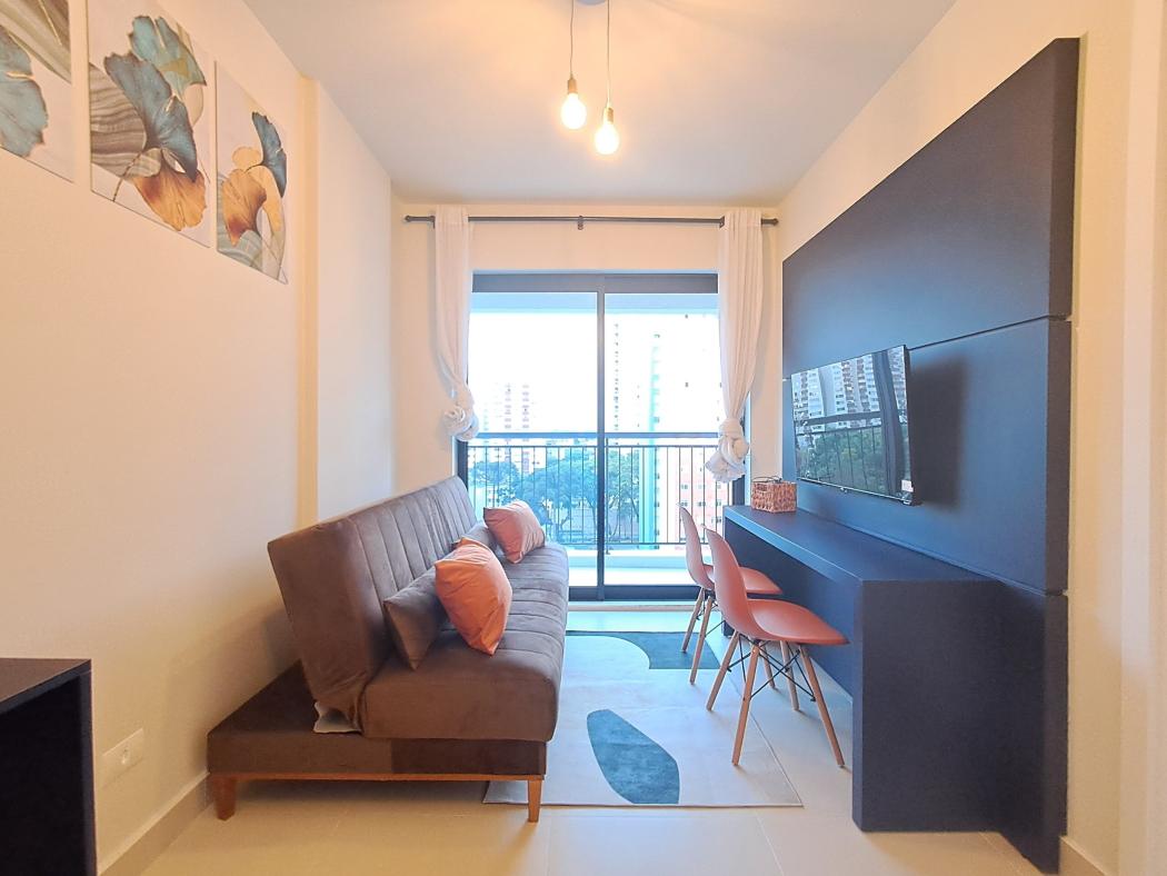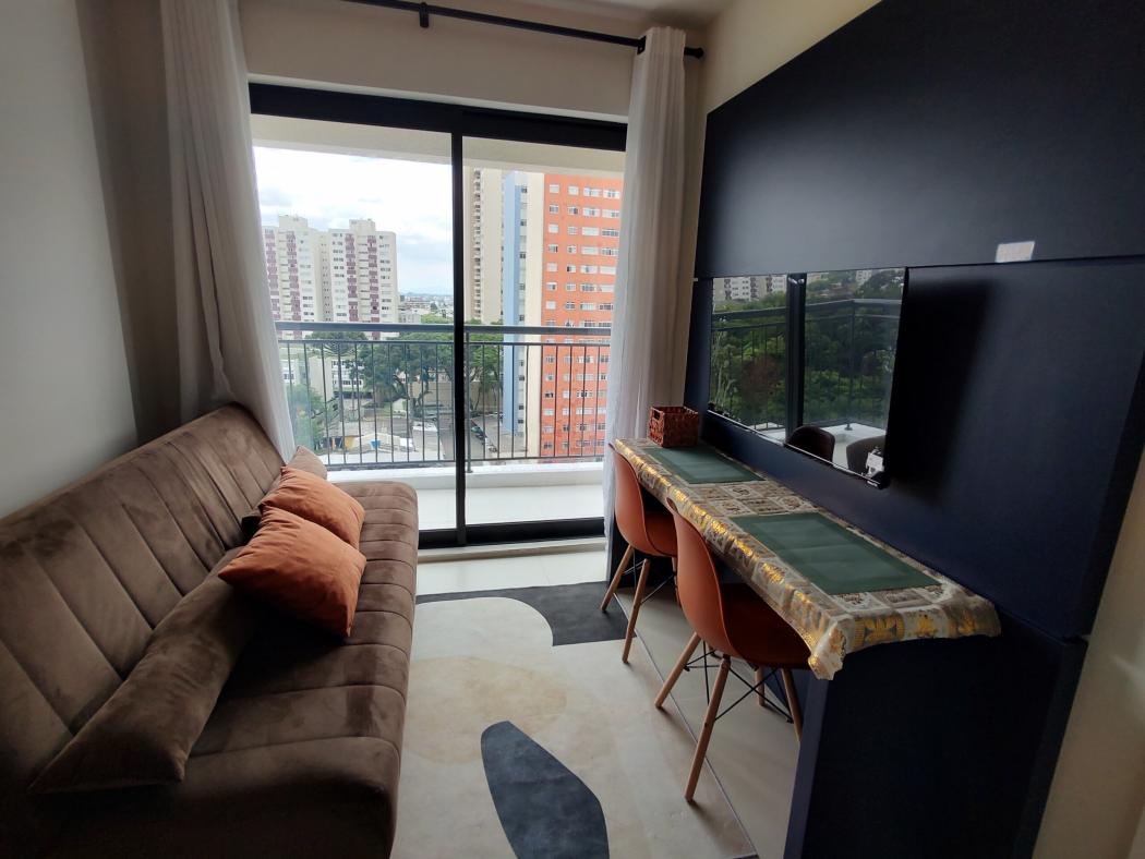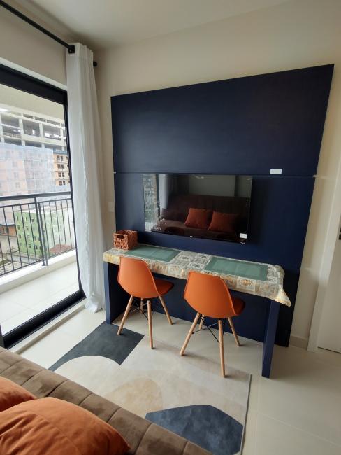 Todo mobiliado, com utensilios de cozinha e roupas de cama. Com uma ampla sacada, vista incrível da cidade e da Serra do Mar.