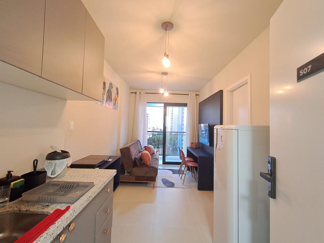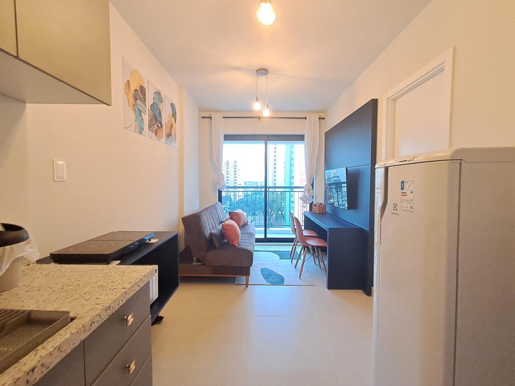 1 quarto separado, cozinha integrada a sala e área de serviço, a sala tem uma porta janela de vidro integrada a ampla sacada.